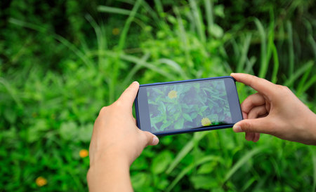 Hands using mobile phone taking picture in summer nature