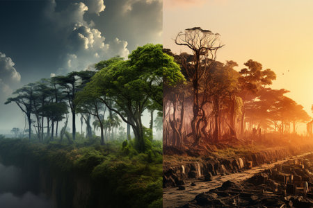 This image presents a striking visual contrast between a vibrant, flourishing natural environment and a desolate, polluted landscape. It features lush green trees, a clear blue river, and a bright sky juxtaposed with barren trees, dry earth, and smokestacks under an overcast sky. This composition could be used for educational materials or environmental awareness campaigns.