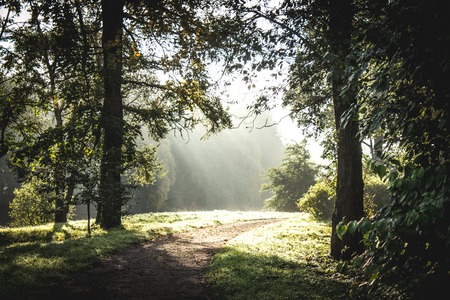 Morning misty autumn park. Misty morning. Fog in the park. Picture autumn park. Background foggy autumn park. Park at sunrise in autumn