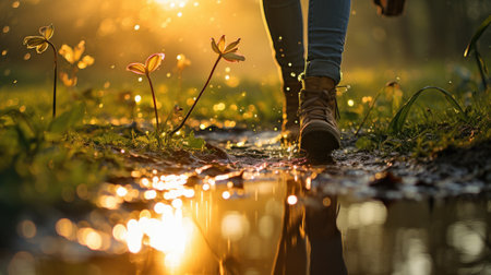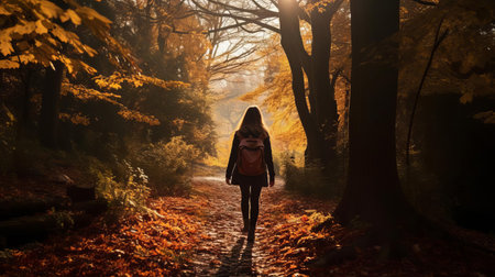 Walking along a scenic trail covered in autumn leaves during sunset in a peaceful forest setting. Generative AI