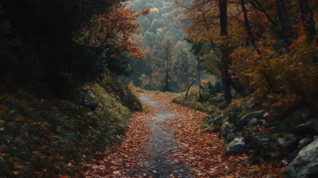A mountain path covered in fallen leaves, winding through a dense forest, evoking solitude and the changing seasons.