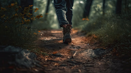 Close up a person's feet walking on rocks , Walking on a trail in the woods , Travel Concept , Generative Ai Technology
