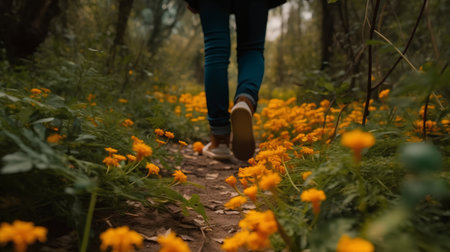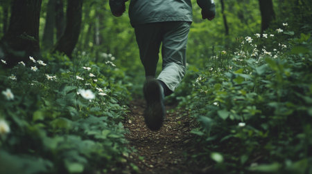 A runner moves swiftly along a narrow trail in a vibrant green forest. The surrounding wildflowers bloom, capturing the essence of nature during a serene morning.