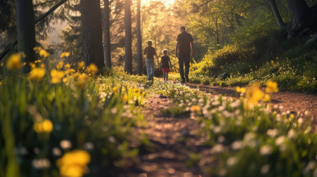 A woman and child stroll through a forest, hand in hand, amidst trees, plants, and natural woodland landscape. AIG41
