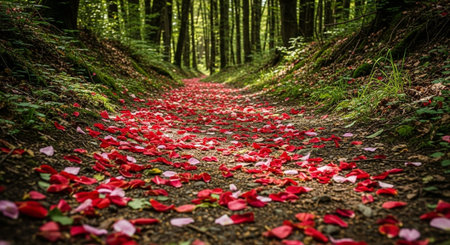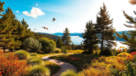 A path winds through a verdant forest, surrounded by tall trees and vibrant foliage. Sunlight filters through the canopy, creating a play of light and shadow. The composition focuses on the natural environment, likely suitable for illustrating themes of nature, travel, or environmental conservation, and various commercial purposes.