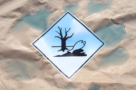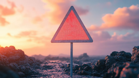 triangle with warning toxic symbol near field, post apocalyptic concept