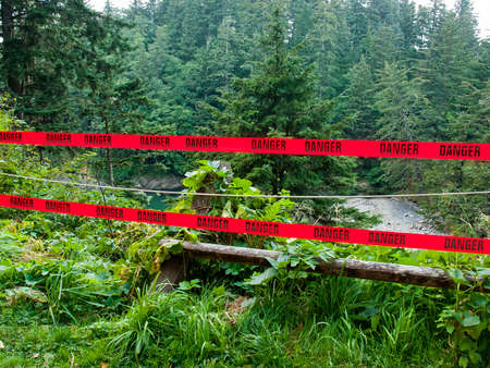 Two Strips of Bright Red Danger Tape in a Wilderness Scene