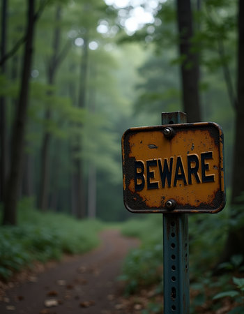 Rustic Beware metal sign amidst lush forest backdrop