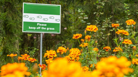 Sign Do Not Walk On The Grass on the defocused yellow flowers on foreground. No Sign Of Trampling The Lawn. Nature concept.