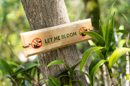 A plaque on a tree in the Maldives Let me bloom. Protecting the environment and rare plants from extinction.