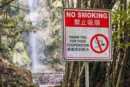 No smoking sign with a translation in front of a waterfall
