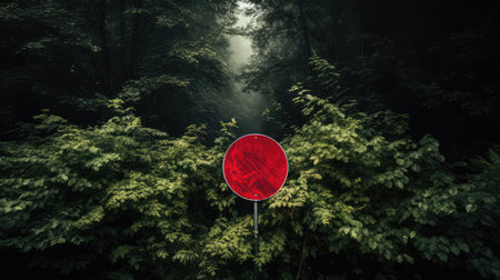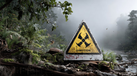A striking radiological hazard warning sign stands by a peaceful riverbank, surrounded by lush greenery and an ethereal mist, evoking feelings of caution and tranquility.