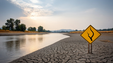 Drought warning sign beside empty waterway. Water crisis and water shortage in summer during long drought is a global problem of drought on the planet