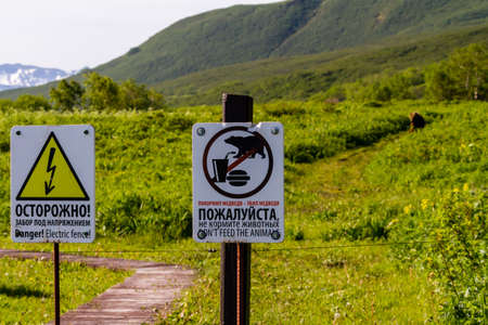 Warning signs on the fence: Don't feed the animals! and Danger! Electric fence! in Russian and English languages. Kronotsky Reserve, Russia, Kamchatka Peninsula.