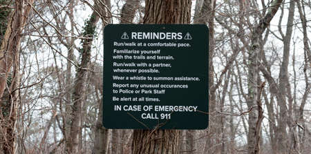 A warning sign reminding people to be aware of the surroundings posted on a tree on a running walking path in the woods.