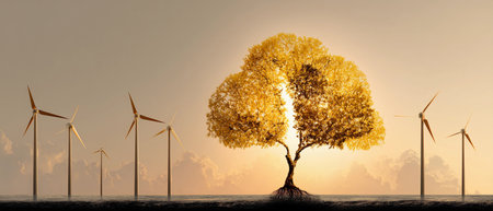 Renewable energy sources like wind solar and hydroelectricity are revolutionizing ecofriendly engineering to combat global warming. Concept Renewable Energy, Wind Power, Solar Panels