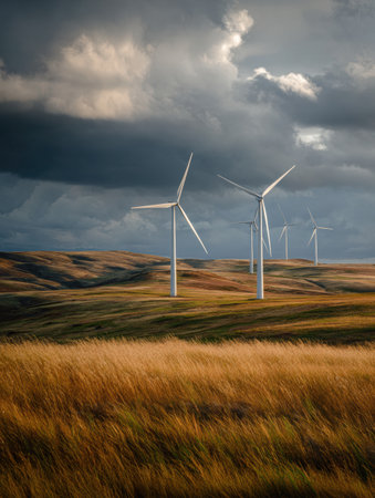 Tall wind turbines are prominently displayed against a moody sky filled with dark clouds while golden grass sways gently in the breeze on the hills.