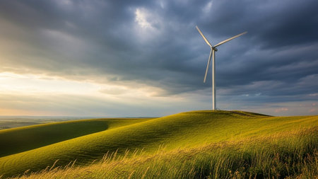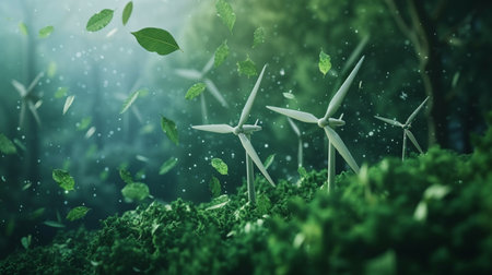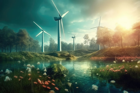 Wind turbines or windmills help to obtain ecological and efficient electricity. Green energy is future. Obtaining electricity without zero carbon emission. Generative AI
