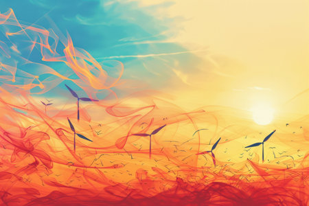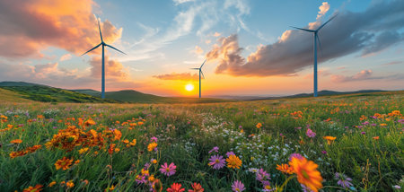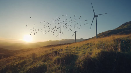 A picturesque view of wind turbines at sunrise, surrounded by a vibrant landscape and birds in flight, symbolizing renewable energy and ecological harmony.