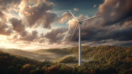 Wind Turbine Rises Above Hilly Landscape at Sunrise with Dramatic Skies Above