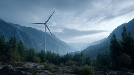 Renewable energy solutions: Wind turbine set against a dramatic mountain landscape