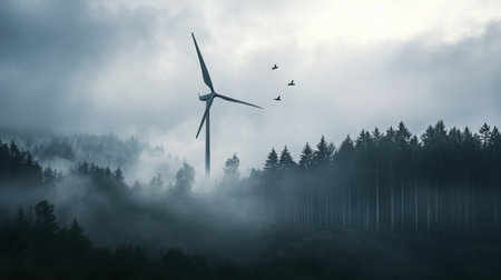 Solitary wind turbine soaring above a lush green valley with mist