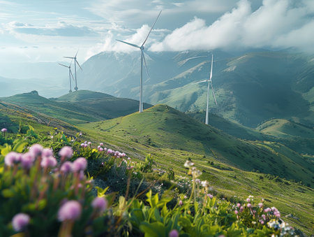 AI generated there are many wind turbines on the hill with yellow flowers, The image features wind turbines, wind energy, flowers bloom, Additional elements include renewable energy, mountain hiking.
