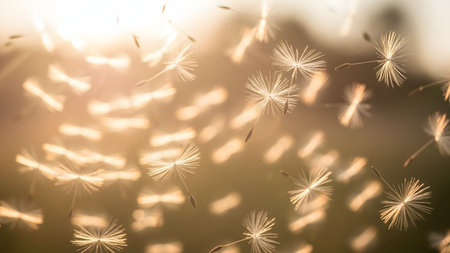 A close-up view of dandelion seeds floating in the air against a golden, sunlit background. The delicate, feathery structures of the seeds are illuminated by the backlight, symbolizing wishes, freedom, and nature's dispersal.