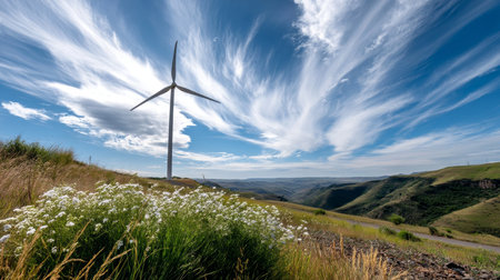 A beautiful wind turbine stands amidst tall grasses under a vibrant blue sky filled with soft clouds. This scene captures the harmony between technology and nature, symbolizing sustainable energy solutions.