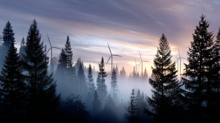 Wind turbines stand tall among foggy landscape in early morning light near an energy farm