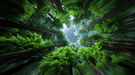 Explore a stunning upward view of tall trees in a vibrant forest with lush greenery, creating a serene atmosphere under a bright blue sky and natural light.