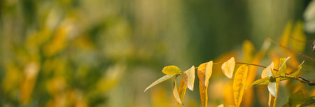 Fresh spring morning colors yellow brown blue needle tree fir branch in a sunny sunset forest park blurry background with free copy space for text. Photo in retro vintage hipster style of processing