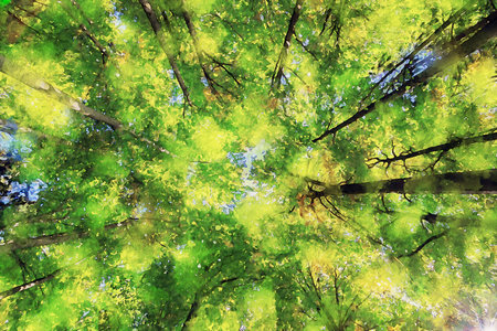 The warm spring sun shining through the canopy of tall beech trees, nature background