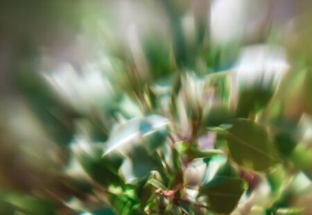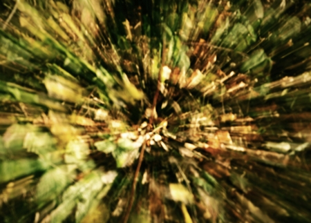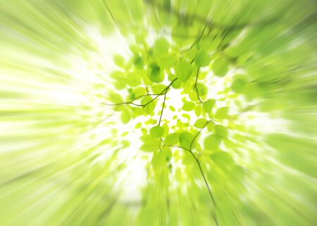 The abstract background radial blurs a cluster of many brilliant green leaves as if mysteriously moving fast from the center in the forest.