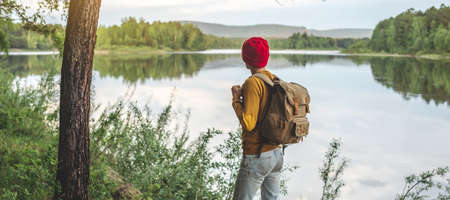 A tourist traveler with a backpack and a red hat are standing by the river with a beautiful reflection from the water in the forest at sunset. Concept active recreation and unity with nature