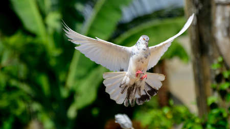 A beautiful white pigeon in flight, landing photo, spread wings close up.