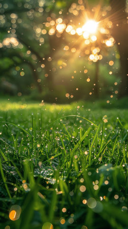 Stock showing soft focus green meadow with sunlight filtering through leaves creating a bokeh effect and a sense of tranquility and natural beauty in a shallow...