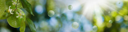 Branch with flowers and fruits of orange and green stylized balls on a beautiful abstract blurred natural background