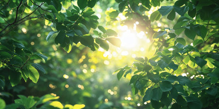 Sunlight filters through vibrant green leaves in a peaceful forest during springtime