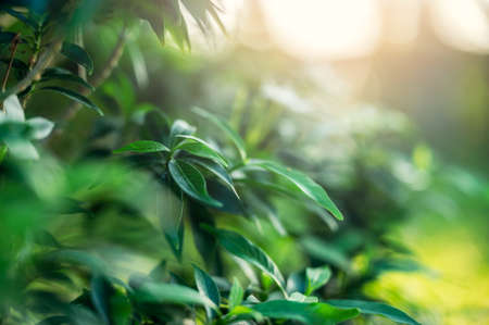Fresh and green leaves on branch with beautiful sunlight. Close up nature greens plants