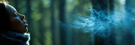In a serene forest, an individual exhales gentle blue wind, symbolizing peace and harmony while surrounded by tall trees and natural beauty.