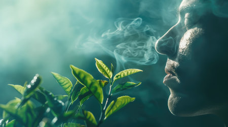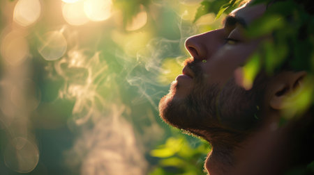 Person exhaling smoke among green leaves with mystical atmosphere