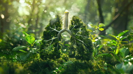 Forest shaped like human lungs, illustrating the vital role of trees in maintaining respiratory health and promoting awareness about the need to protect the environment from pollution and deforestation