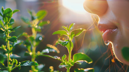 The close up picture of the person is smiling and happy that surrounded with the nature under the bright light from the sun, the feeling of the freshness that surrounded with the green nature. AIG43.