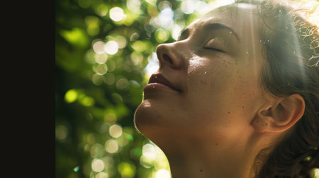 A close-up of a joyful face with a bright smile, looking upwards towards the sunlight streaming through vibrant green leaves, evoking a sense of happiness and connection with nature.