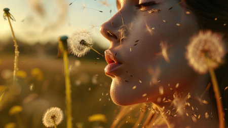 A woman is joyfully blowing dandelions in a field, creating a fun gesture in closeup macro photography. The delicate plants form a circle, resembling a beautiful piece of art AIG50