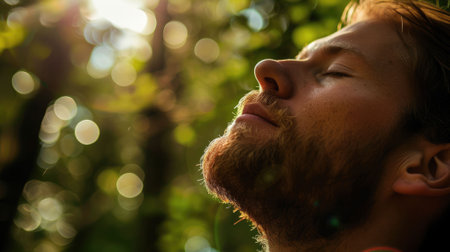 A Young Man Embraces Nature s Tranquility, Eyes Closed, Seeking Fresh Air and Sunlight Outdoors