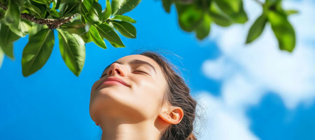 Young Woman Inhaling Fresh Air in Serene Forest, Enjoying Beautiful Summer Day Under Clear Sky
