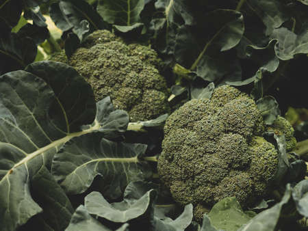 Close-up of fresh green broccoli in the field. Selective focus.