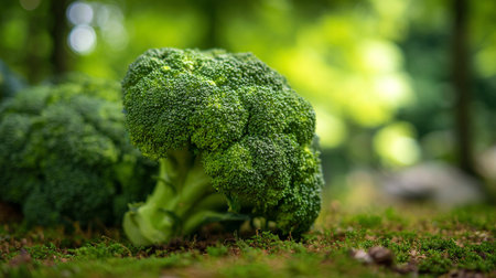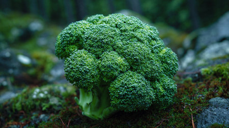 Fresh Green Broccoli Floret on a Mossy Forest Floor Surface